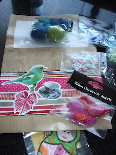 Bolletjes haakkatoen in mooie kleuren, verschillende lapjes stof, een superlieve gehaakte kerstkaart (die inmiddels een mooi plekje heeft). Vilten vogeltjes en vilten balletjes. applicatie, strikjes en zilveren kralen in de vorm van een hart.